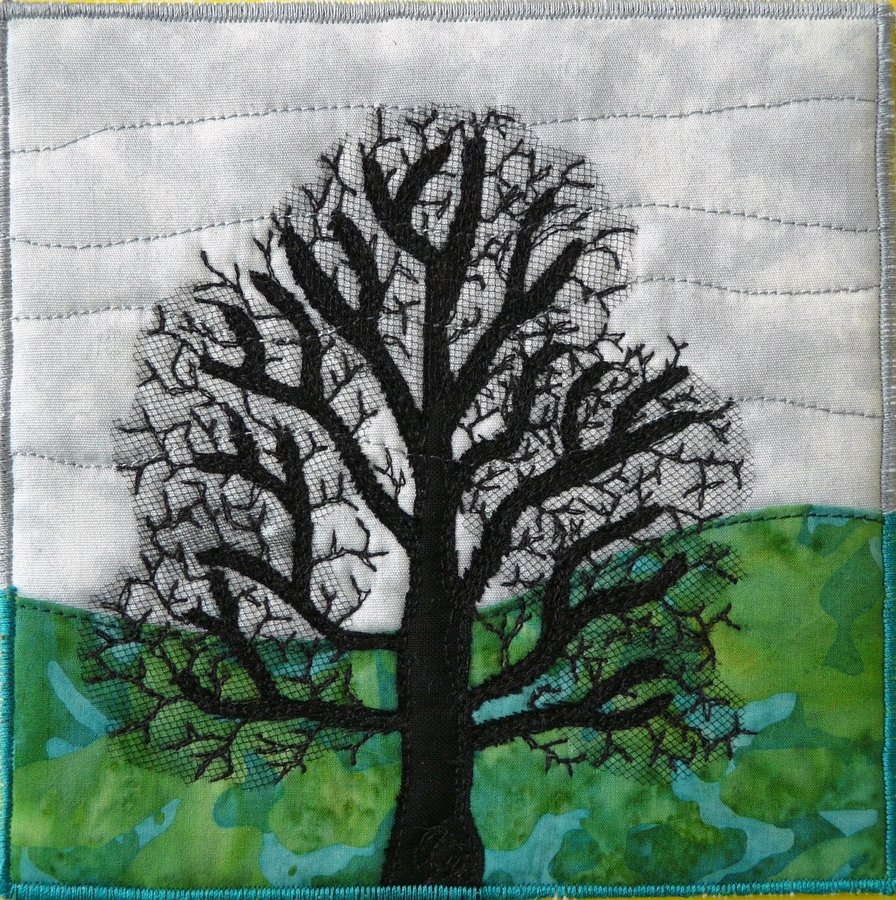 marjolijn Tree - This is a free quilted and embroided mini quilt. I followed a workshop with the America quilter Mary L. Hackett, when she stayed in The Netherlands. She inspired me a lot. A lovely lady who wants to share her knowledge. I made this postcard for a fibermail swap. The theme was "landscape" and immediately I wanted to make a tree in this style. And I love it. The first tree I made for the swap, but I wanted to make one for my own as well. And you never me two exactly the same. It is made of cotton and tulle. And free embroidery for the little twigs.