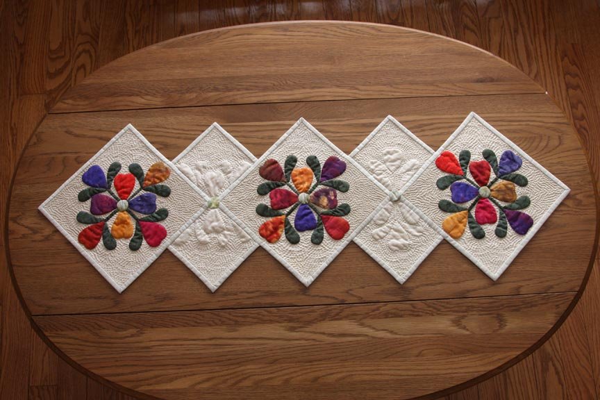 Rejeanne My Flower Garden - I wish I could give full credit to the designer of this pattern or even remember exactly which magazine I found it in. I loved making this because it was easy to take anywhere. The appliqued flowers where all cut from the same piece of fabric.