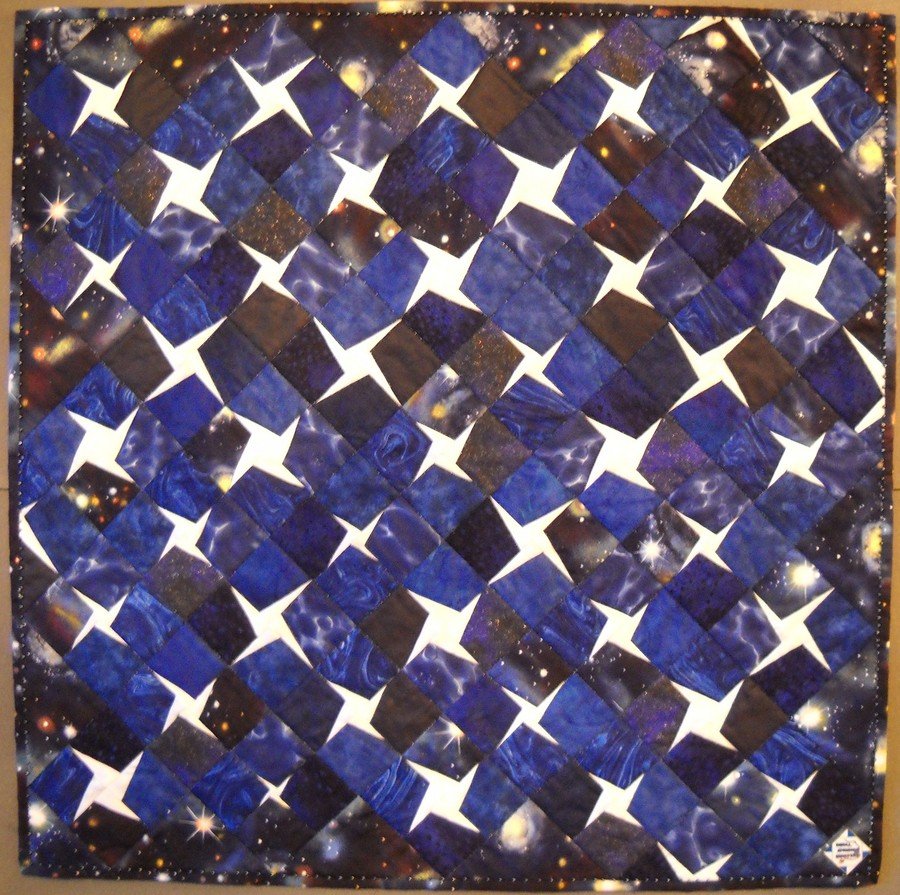 Charlotte Dreaming Amongst the Stars - Designed for the Dream Rocket Project. Sponsored by Coral Springs Quilters. Different sized paper-pieced star blocks quilted with metallic hologram thread gives the appearance of twinkling stars from a distance.