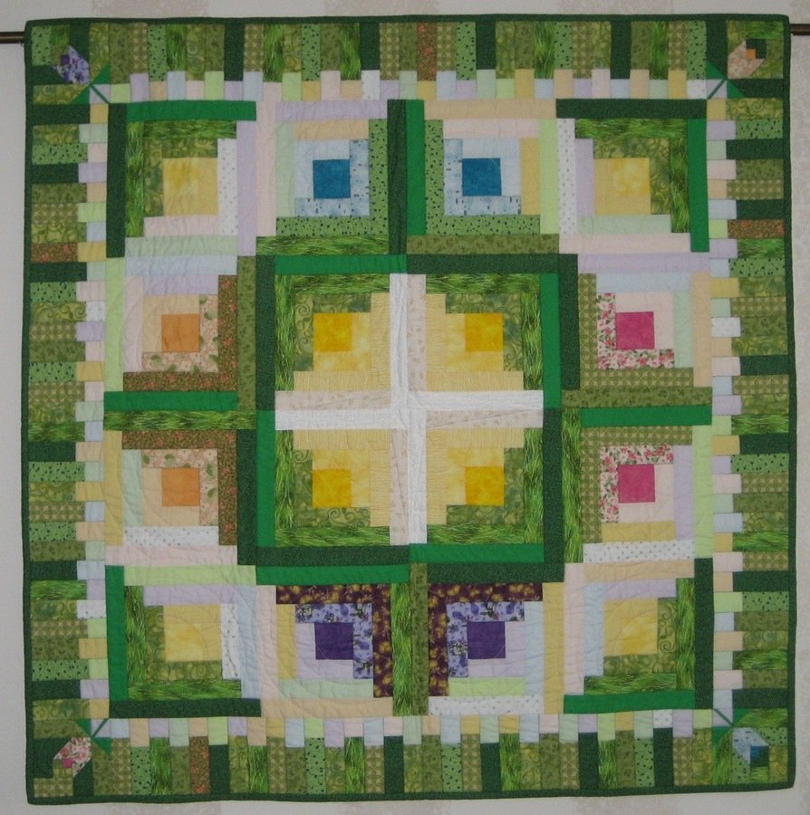 GuysQuilt2 Easter Comes to the Cabin - 2009 guild challenge (I never got around to taking a photo.) The theme was spring, we were given a size range, and we had to use the white with blue polka dots fabric. When I think of spring Easter comes to mind and after trying to design something really cool and original found I myself using log cabin blocks!