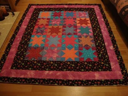 JETTY Bright Stars - This was my first attempt at star blocks which I pieced last year, and now having my long arm machine practiced my quilt techniques using a ruler for stitching in the ditch, and I also practiced lots of freehand fillers in each star block. I freehand feathered the borders.