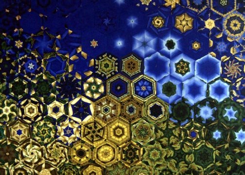 | Design Source - Description | Inspired by a class on the one-block wonder technique for hexagons, and a beautiful piece of oriental print, this graphic version gives me the feel of a forested area, with the night sky and northern lights of Alberta. |