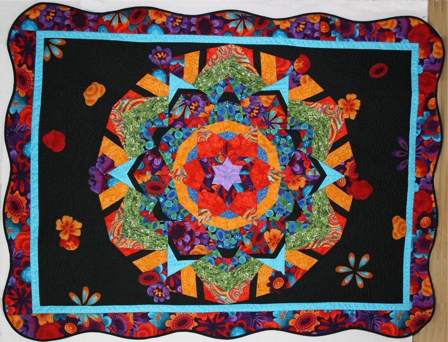 CathyJoMeans Floral Fantasy - Floral Fantasy was made in the class taught by Rita Blocksom Feb 2010. After the basic kaleidescope was completed I added to the length of the quilt and scattered appliqued flowers cut from the border fabric to bring the flowers out of the kaleidescope and in from the borders. This was an amazing quilt to watch in progression and if a stretch from my traditional type of quilting.