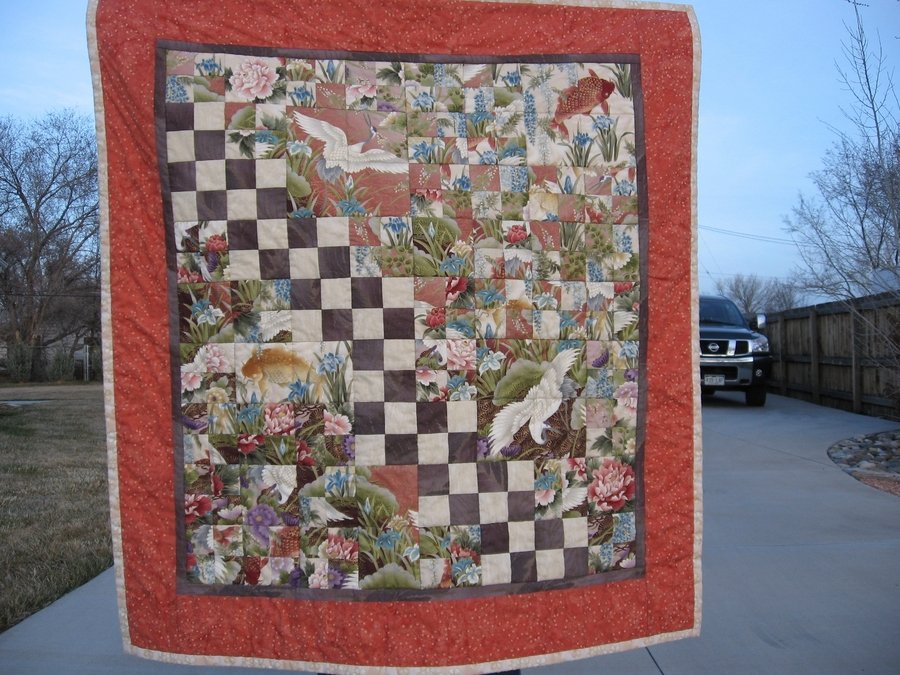 | Design Source - Description | This quilt was made from fabric purcahsed during a trip to Hawaii. The pattern was inspired by Judy Sisneros' 9-Patch Pizzazz, but I used 4-patch blocks instead of 9-patch blocks. |