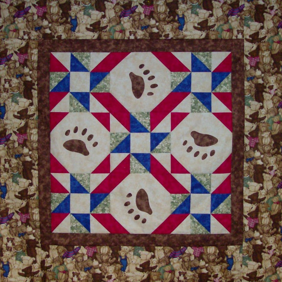 Newaygoquilter Bear Tracks - The border fabric of bears was the inspiration. Teddy bears and friendship with the linking of the blocks all played a part in my inspiration.