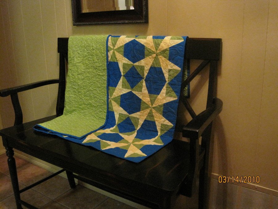 mcurtis1213 Lesson Learned - This quilt is pretty embarrassing to post, but I learned from it. This was my first attempt at triangles (which I failed miserably). I didn't read instructions well and didn't line the triangle edges up the way they were supposed to. Hardly any points match and the ones that did were by total accident. I almost didn't finish it, but decided to use it as my first attempt at free-motion-quilting (which that part I'm pretty proud of). I didn't make the full pattern since the blocks turned so aweful. The pattern was "Windy by the Lake" by Weeks Ringle and Bill Kerr published in American Patchwork and Quilting.