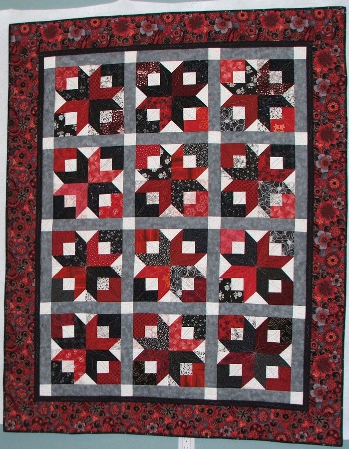 pegjo Peg's Boxy Stars - This quilt was made as a mystery quilt by my Iowa Quilter's group. We also exchanged 2 1/2 fabric strips for the quilt but used our own sashing and border.