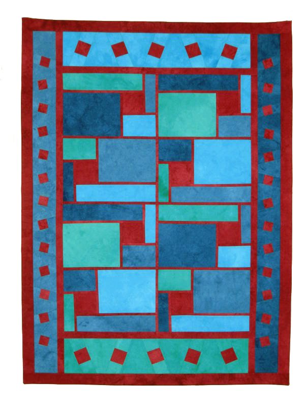 Jolet NOTAN 01 - Based on a paper collage I made several years ago exploring the principles of "Notan". It has 4 colors of blue/green plus a deep pink, which unfortunately don't come out right in the picture. All Ricky Tims fabrics. Eventually I figured out how to do the piecing.