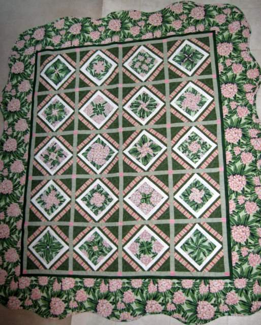 | Design Source - Description | I started with the Supreme pattern for the secondary kaleidoscope effect in the blocks but changed up the design, used striped border around blocks and scalloped edges. |