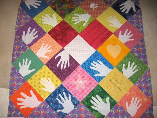 | Design Source - Description | Got hand prints from all immediate cousins, aunts,uncles and grandparents from USA and appliqued them to quilt blocks with hand written names to show her American side of the family. |