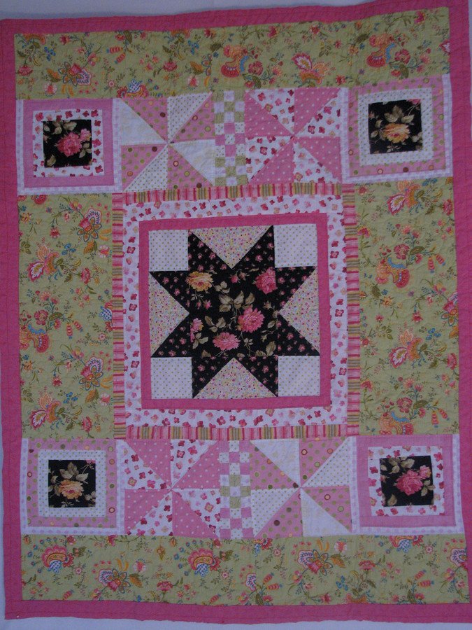 jbirdsander Annabelle's quilt - I saw the Lakehouse Dry Goods fabrics (La Belle Rose) in a magazine a while ago in which a star was in the middle with stars all around it and border fabrics. I fell in love with the quilt, but when I found the fabric months later, could not find the pattern so I decided to make several of my own design. I also loved the green fabric (purchased from Connecting Threads) and wanted to make it a feature of the quilt. Since Annabelle's room was going to be pink and green, it was the perfect combination of fabrics.