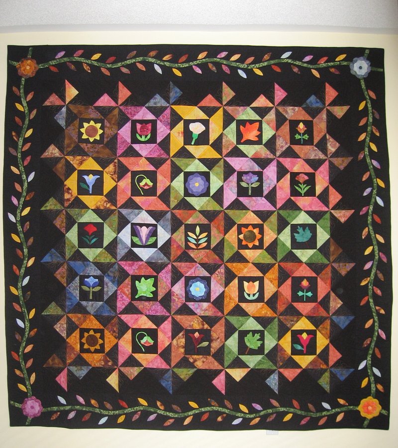 Nepeanquilter My Midnight Garden - Learned to hand applique small blocks using a variety of applique methods. Designed the setting squares and applique borders. Machine quilted. Juried into the 2009 CQA/ACC National Juried Show.