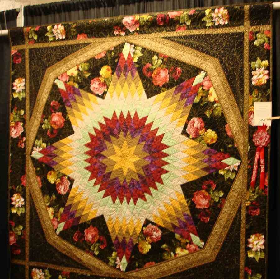 pamo65 Lone Star Rose - I started the lone star in a Quilters Day Out with my guild. The original fabric from which I chose the star colors was never used. I decided to set mine on point and used a Jinny Beyer type setting. I used Michael Miller's Spanish Rose fabric and a black and metallic gold border fabric. Patsy Thompson was my inspiration for the quilting.