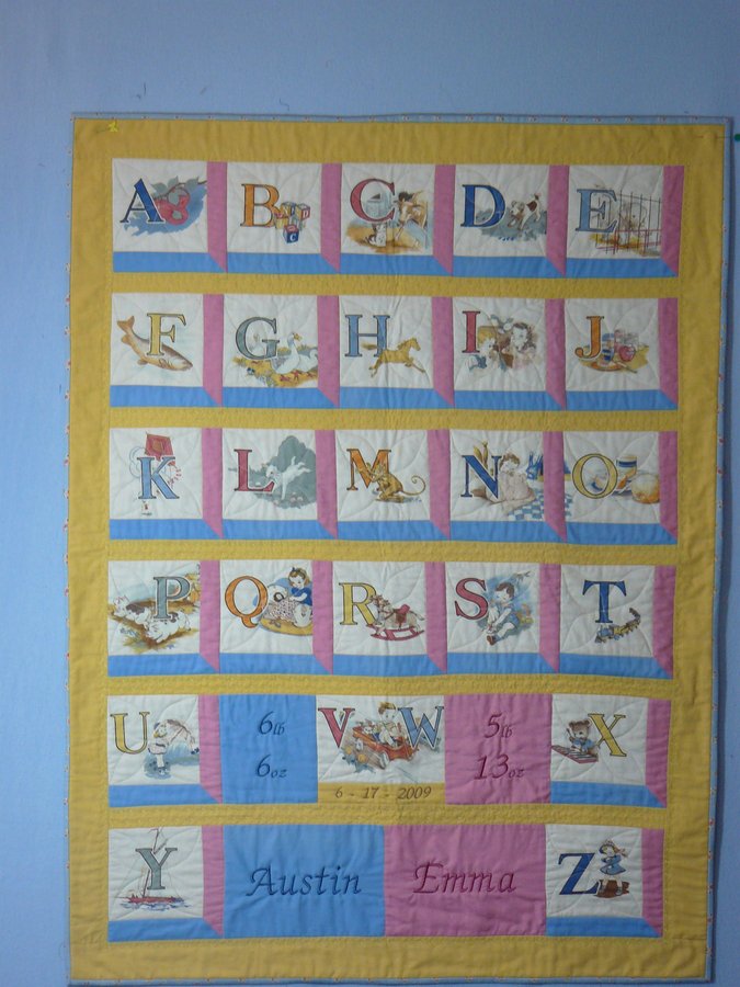 | Design Source - Description | Alphabet quilt for newborn twins. Retro pictures with monogramed names, weight, & date of birth. |