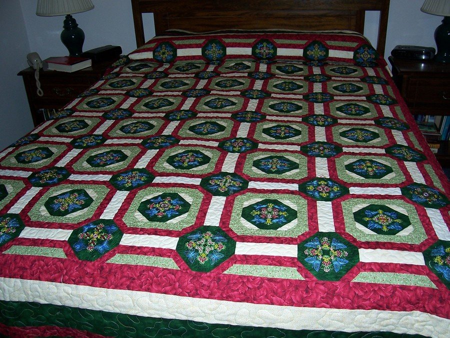 nanasosews Fred's Butterfly Garden - This was a pattern for a baby quilt but I like look and increased the number of blocks and modified the design of the border to meet my needs. I don't sell my quilts - I give them away to family and friends. I thought it was time to make a new quilt for my bed. My husband, Fred has a butterfly garden therefore the name of the quilt. This is a very simple pattern. Each block is machine embroidered on my Babylock Esante with the designs from Ace Points. I also free motion quited the quilt.