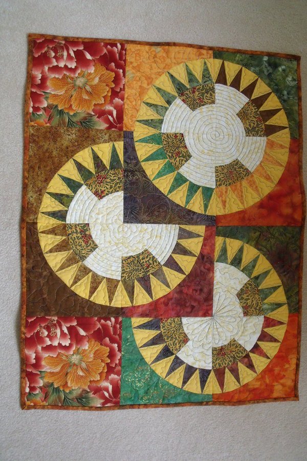 JudiB Sunburst - I took a class from Sharon Pederson last summer in Sisters, OR and this is the finished product. I decided to free motion quilt it and the flowers are thread painted, my first attempt at this technic. I just finished it last month.