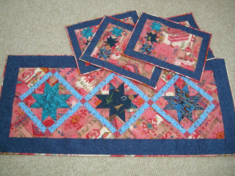 Melynda Southwestern Table Runner & Placemats - Purchased fabric for table runner when I saw the project but didn't even start it until 2009 and finished it this year. The salmon main print included fabric I intended for placemats years ago to match the window valances I made and used in my dining room. I reused the valance fabric for the backing on this project.