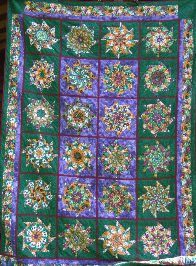 Danese Mardi Gras - This quilt was for my oldest daughter. I quilted the blocks individually and then joined them. The back became a checker board pattern and the upper corner blocks were hand quilted.