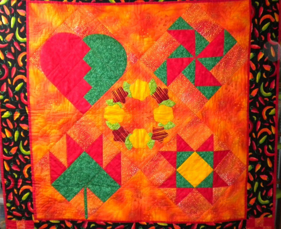 Danese Hot Pepper - This quilt was made in the first class that I took. This is my first quilt and even though it was finished and usable in 2005 I wanted to add some hand quilting and did not decide on a pattern untill 2009 when I finished it.
