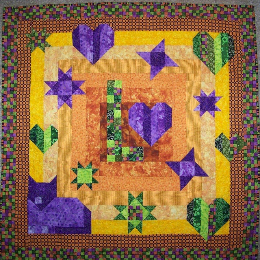 theothermarion Lindsey's Quilt - My daughter chose green, purple and orange for her baby's quilt, and wanted a cat in the center. But then it became a cat quilt, so I let it lie down in the corner instead. I spent a lot of time with the graph paper, and finally came up with this design. It took a while to figure out just how to put it together more or less efficiently. It is backed with green flannel, and Lindsey shows his approval by going to sleep under it!
