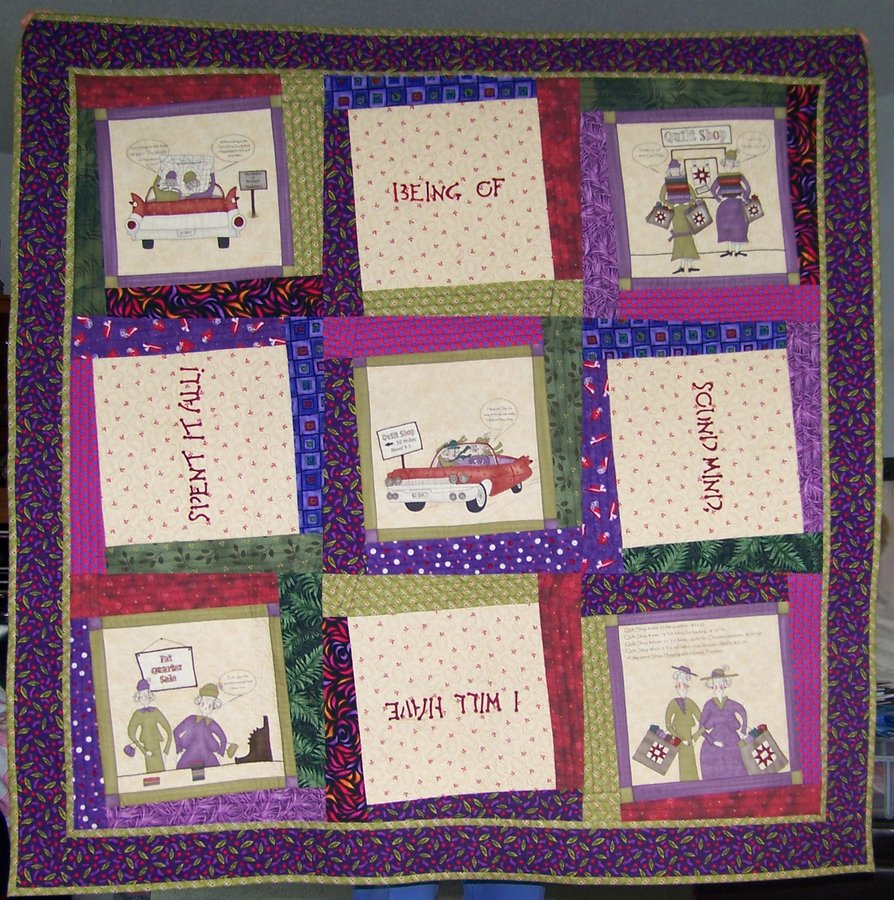 EditorAnne Mum's Will - As we pore over her latest acquisitions, my mother often tells me, “When I go, there won’t be any money, but there’ll be lots of stuff!” She always ends by declaring, “Being of sound mind, I will have spent it all!” Luckily for me, a lot of that stuff will be vintage sewing equipment and quilting supplies. She must have said this three or four times during four days we spent together in July of 2006, so I decided she needed a wall quilt that reflected her intent. After a month of puzzling over what type of imagery I might create, I remembered the “New Quilts, Old Friends” panel designed by Sandy Gervais for Moda. When I gave Mum the quilt for Christmas, she laughed. “That’s right!” she said. “And don’t you forget it, kid!”