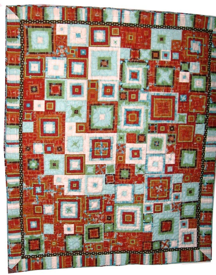 BrendaF Where Redwoods Meet the Ocean - Made for my daugher for college graduation, I used a striped fabric, layered 4 strips stack and whack style and cut 4 identical triangles. I sewed together to form 9", 6", an 3" blocks. The idea came from a quilt design by Kaffe Fassett, however his method did not stack and whack, just used various striped tickings. I thought it would be fun to try....Colors were wonderful as she attends college where the redwoods meet the ocean as represented in the colors of the quilt.