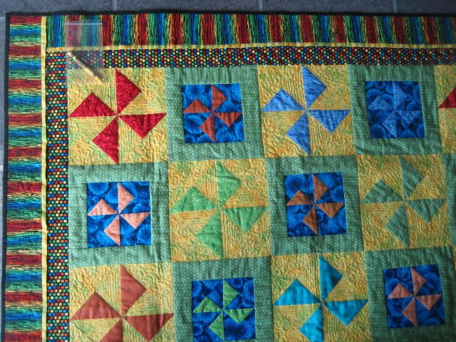 purplepretty Spinners - I chose to make this quilt for a color challenge with my local guild. I was to use bright yellow with any other color I wanted added. I was attracted to the pattern because buttons were used in the center of each pinwheel. I added those after the picture was taken. It hangs in my home now.
