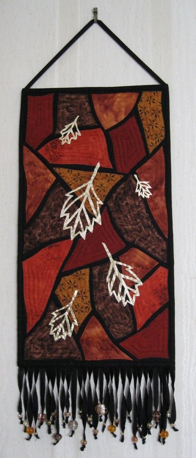 leeannq Falling Leaves - Small Mosaic Wall Hanging with Beaded Fringe. Fused Applique. With Gold Lamé for leaves.