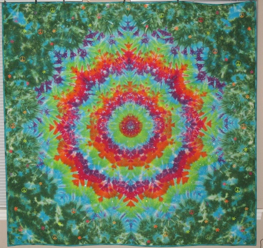 debr33 Woodstock Revisited - This quilt started as a one of a kind tie dyed sheet, the minute I saw it I could see it quilted and embellished, There are embroidered peace signs,flowers, 1800 crystals and 1000 holograms. I put the names of 20 performers at Woodstock on the back of the quilt.