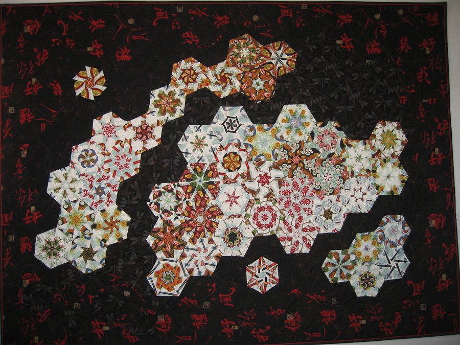 quiltngolf Sushi Explosion - What to do after miscutting the sushi patterned fabric into two different sizes instead of all the same so they would fit together? Regroup and redesign them with an undulating border and variety of blacks for the background. Paula had the perfect KOI fish quilting pattern and we were set.