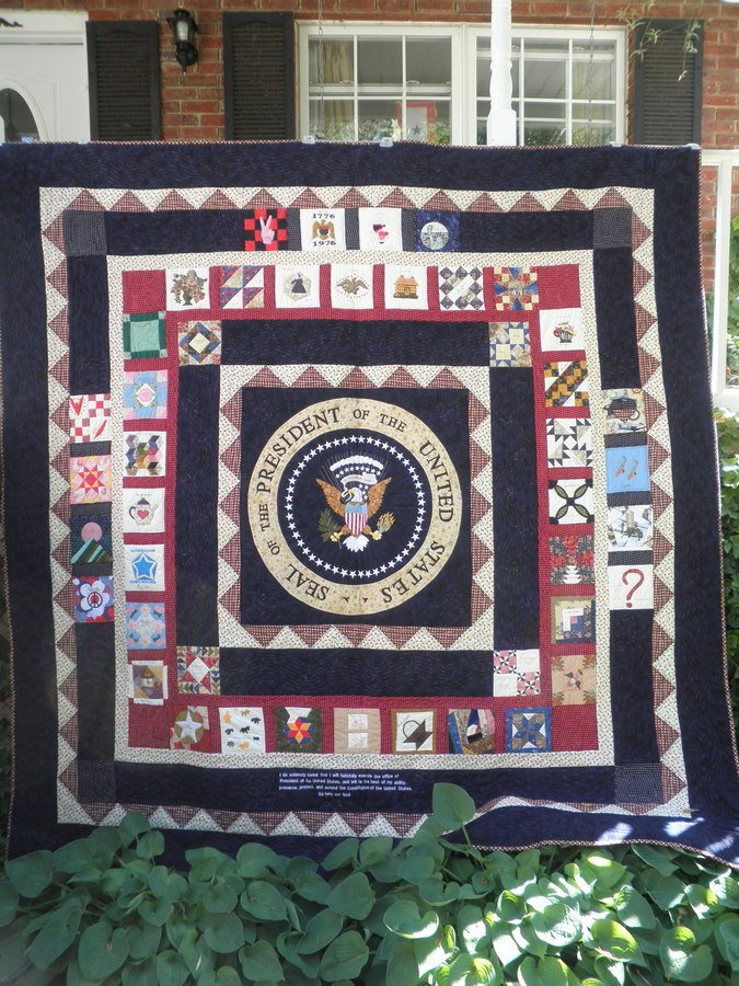 CarolL Mr. President - This was a block of the month fabric study at my local quilt store. We studied the trends in fabric from the first George W. to the current president although this quilt was completed before the 2009 election. The Presidential Oath is embroidered on the bottom of the quilt.