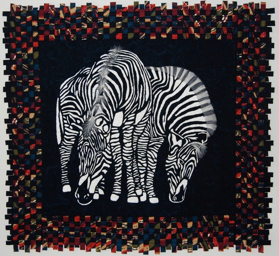 InwoodNYC When you hear hoofbeats... - Based on a photo taken by my son of two Grevy's zebras in the National Zoo, Washington, DC. It is done in reverse applique by machine, the edges of the stripes are distressed to resemble hair, the manes are thread painted with variegated and metallic thread. The borders are woven and attached separately. Machine quilted in the approximation of a zebra stripe pattern.