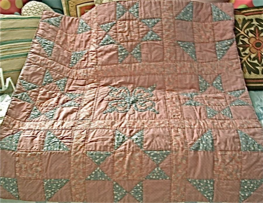 suzie1 unknown - 100% Hand quilted in my first class. It is a 39" square in purple and blue and white shoofly and ohio star 9 square blocks and the border is blue, white and purple the same as the sashing. The backing is purple and white the same as squares on front.