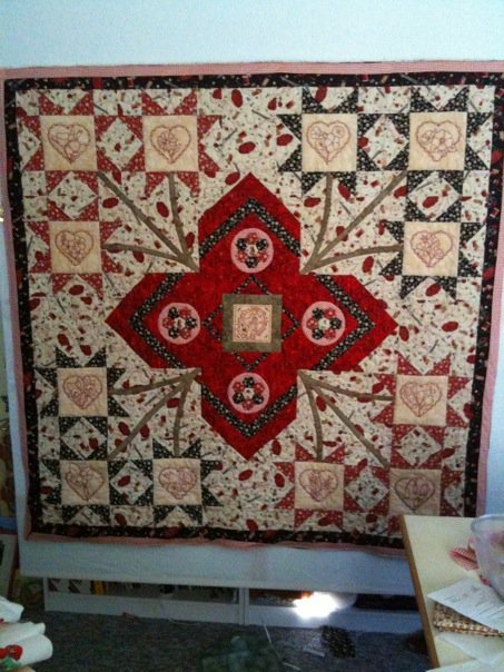 | Design Source - Description | Did the 12 redwork blocks but wanted something different for a setting. Pieced blocks, enghlis paper pieced Hexigons. |