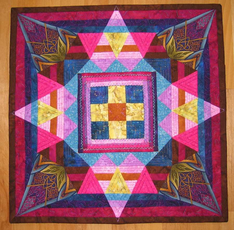 | Design Source - Description | My 'New from Old' contest entry. Lots of metallic thread that's invisible in photo. I chose to interpret the theme from a design perspective. History of quilting in a nutshell. |