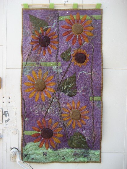 StephanieF Daisy Day - This is done using a fiber layering technique - the daisies are actually silk flower parts, and there is a layer of tulle on top to hold down the loose pieces so it could be quilted.