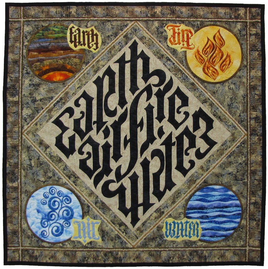 bettyannseeman "Earth-Air-Fire-Water" - I fell in love with the graphics designed by John Langdon for Dan Brown's book "Angles & Demons" I asked John for permission to use them in my quilt and he graciously agreed. The center graphic and the four words for the elements are ambigrams. The graphics read the same right side up and upside down. The quilt design is original. This quilt lived on my design wall for nearly five years as I learned and developed techniques that allowed the work to progress. I hope you enjoy it.