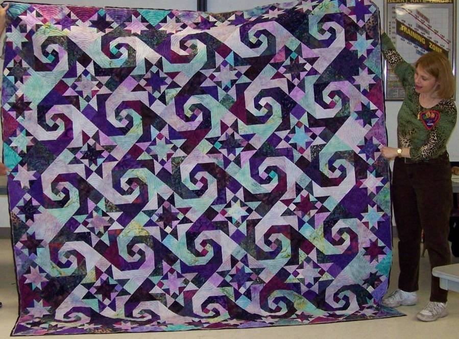 cblong03 Shakespeare in the Park - My niece is getting married on 8/8/10, and this is her wedding quilt. It's mostly batiks (who knows how many different fabrics / solid purple batik backing), wool batting, and machine quilted with nylon on top and Bottom Line in the bobbin. The rebel in me decided to do concentric circles a half-inch apart, rather than continuous line spirals, or something like that (What the blankity-blank-blank was I thinking! I'll be snipping threads from circle-jumping for weeks, because I got lazy and didn't do it as I went along.) I started it in July09, finished the top in Jan10, and just finished the quilting this week (about an hour before my guild meeting...just in time to bring it for show and tell). I still have to block it and put the binding and label on, but I thrilled I'm going to have it finished on time!!! Since the pic was taken, I've soaked it in ice water to remove the water-soluble blue and white markers (the cold water in AZ is NOT cold enough to do the job), washed it in hot water with Synthropal with two dye catcher sheets (I think I prewashed the backing, but nothing else, plus added 4 tons of starch along the way.), and dried it in a hot dryer. No need to call the quilt police. I got the effect I was going for, lots of puckery goodness and texture that hides my still-developing-confident-beginner-free-motion-quilting skills (long winded way of saying my circles aren't the smoothest). No, there isn't bleeding of the dark onto the light, and if there is, I can't find it. I slept under it last night, just to see if it works, and it does...haha! I'll wash it again, after the binding, as my cat insists on sitting on my lap, when I hand-stitch the back, and the fabrics could be a bit softer. My theory is enjoy the quilt and use it until it's nothing but shreds! If my niece puts it up in a closet, I'd be crushed!