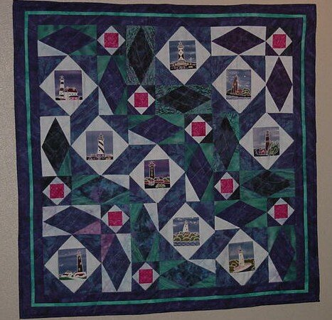 | Design Source - Description | Designed with Electric Quilt 5, using the "storm at sea block". The Lighthouse pictures are purchased hand painted batiks. I designed the quilt around them. |