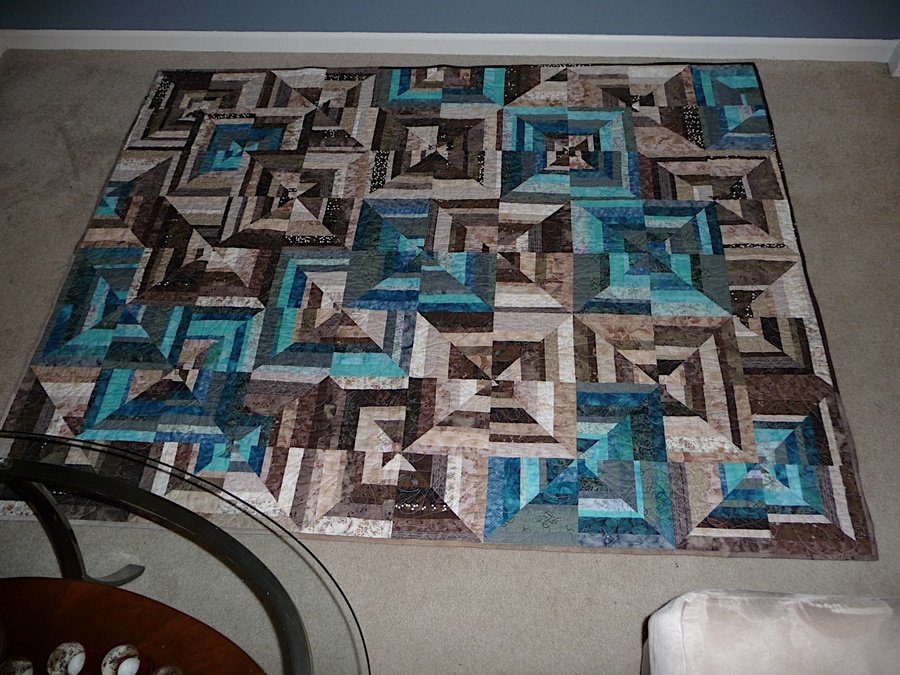 ccivis Grandma's Serenity - I made the quilt for my grandmother. I picked taupe because that would best match her living room the teal blue was picked and really popped next to the taupe. This is my first ever quilt and I love it. It was quite a lesson on light, medium and dark.