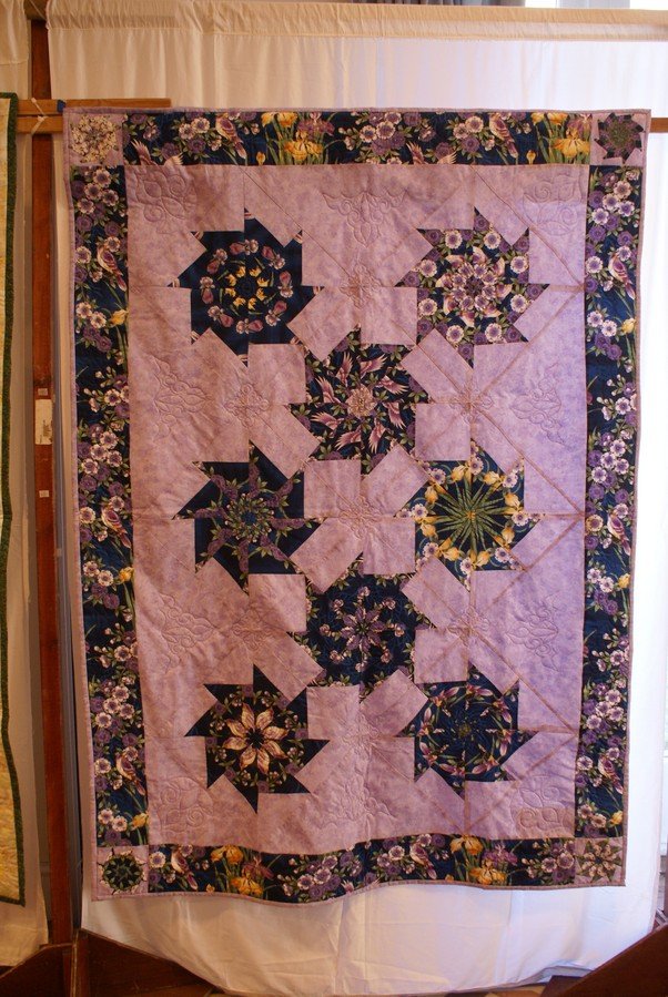 allstontowers All Stacked and Whacked - Using Japanese fabrics and Moda Spraytime, this quilt is machine pieced and quilted, using the embroidery module of my Bernina Artista 630. The quilting designs are adaptations of the Holice turnbow designs which are in the Bernina software.