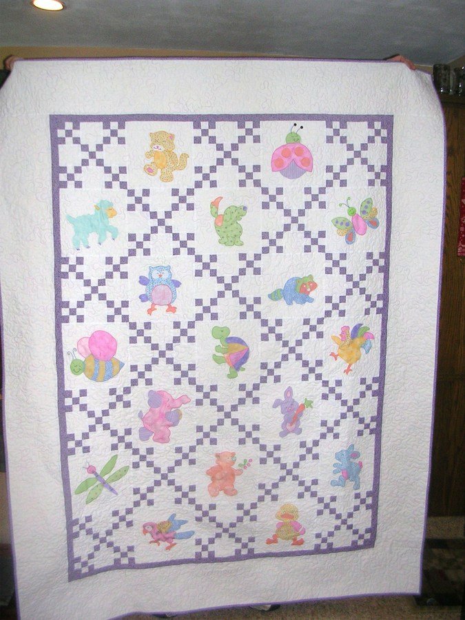 | Design Source - Description | This quilt is a traditional Irish chain with machine applique animals from a variety of coloring books and commercial patterns. |