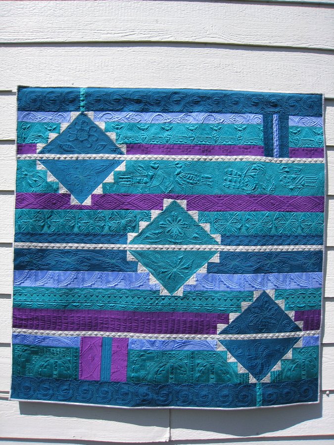 annlp Pueblo Pottery Song - Made from just 2 kinds of fabric - the dark teal, dark purple and silver are a silk/cotton sateen and the lighter teal and lavender are a polyester satin. This is as close to a wholecloth quilt as I seem to be able to make - somehow I just need to add piecing!. I have an anthropology background and have always loved the Ancestral Pueblo pottery designs. I drew up all the quilting based on pictures and drawings of pottery (some from Decorative Art of the Southwestern Indians by Dorothy Sides (Dover). Quilted on my Bernina.