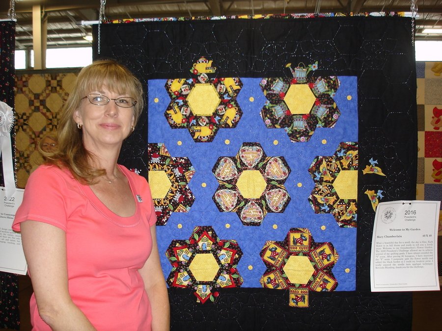 TheNeedleneuk Welcome to My Garden - The Hexagons were fussy cut. Some hexagons were split, the black border was added and broderie perse motifs were hand appliqued to complete the flowers. The quilt was embellished with tiny yellow yo-yo's and beads. I quilted with a black iridescent thread.