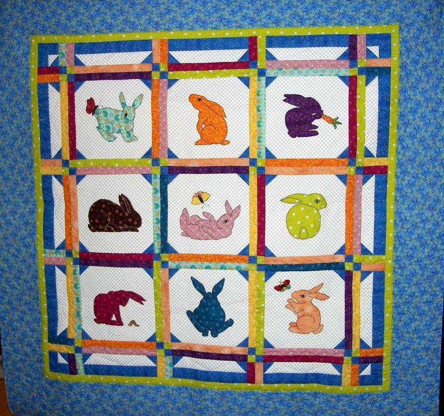adamsme Some Bunny Loves You - This quilt was made for my niece and her first baby. The layout was from Darcy Ashton's "Grandma's Bunnies" booklet. I selected the blocks and fabrics. Sandi Wagner quilted it on her longarm machine. There are carrots quilted into the blue border.