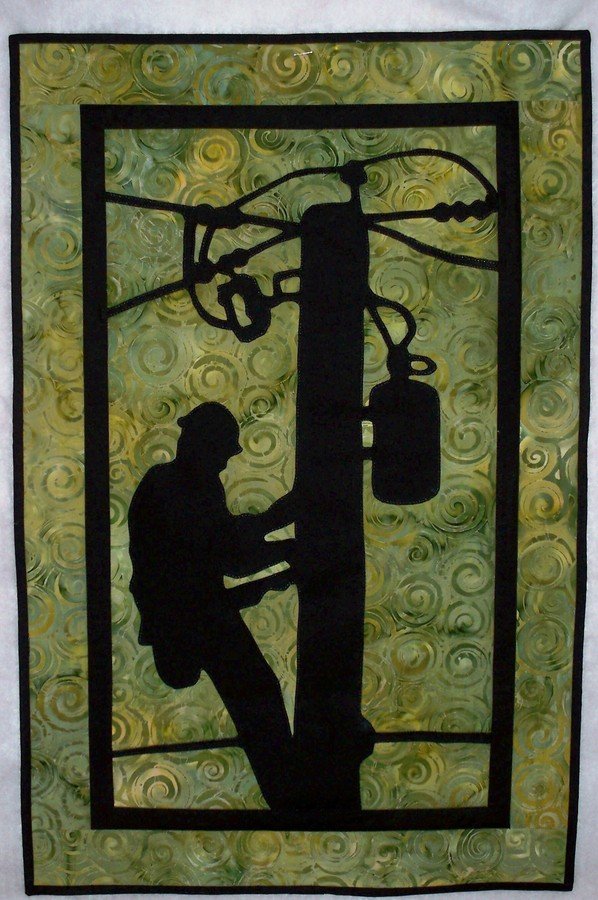 mms61371 My Lineman - I had a picture of a lineman at home. I used an overhead projector to trace an outline of the picture. Then, I used the overhead to blow the image up to fit on a piece of poster board. I used fusible web and blanket stitched the outline of the design. I put a black border, to frame out the design to make it more prominent. It was all stitch in the ditch. I did not add extra machine stitching because I thought the image was enough of a design.
