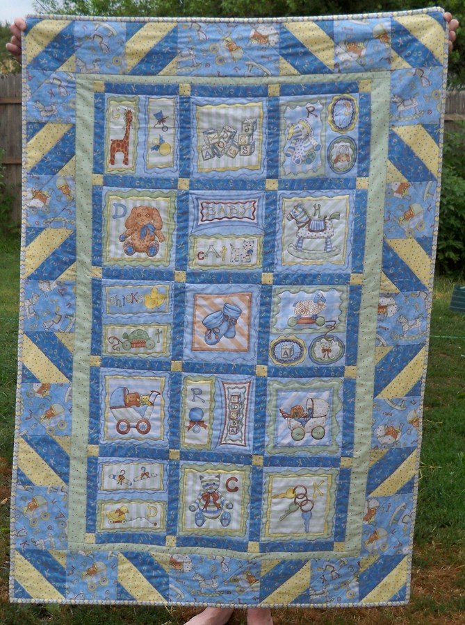 quiltendeb Sugar Biscuits - Needed to make some baby quilts quickly, so thought I would try some pre-printed Blocks and fabric from the Sugar Biscuit Collection by Wilmington Prints. I saw this quilt in the Easy Quilts Magazine and just fell in love with it. Still has enough piecing in it to satisfy my need to make quilts, but by using the printed blocks it IS quick and easy. Also can assemble the blocks how you find pleasing. The fabrics also come in the pink colorway.
