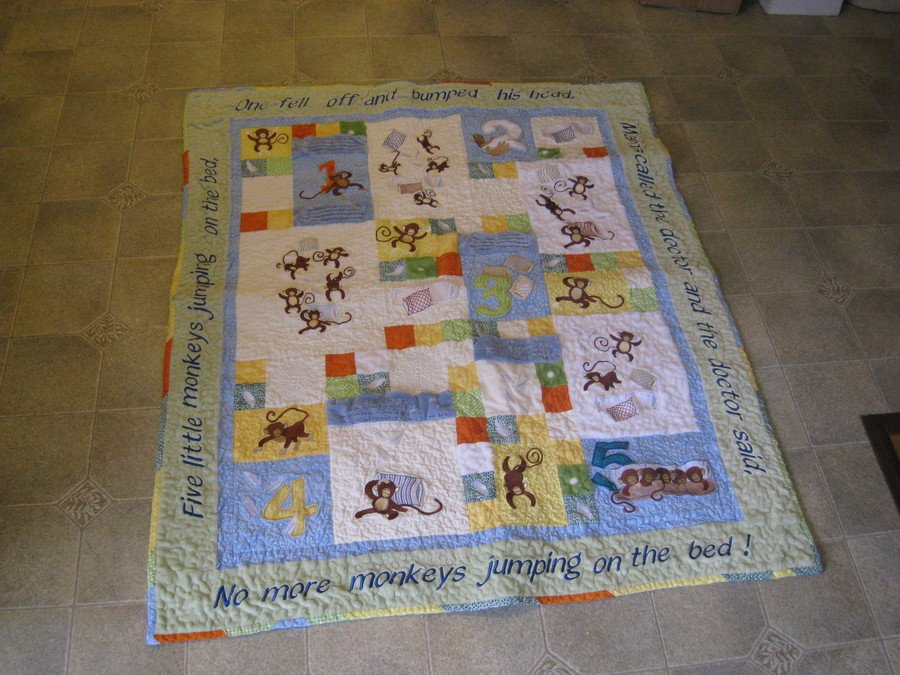 Peggybernal 5 Little Monkeys - This is a baby quilt that I made for my newest grandson. His brothers like to come to our house and play monkeys jumping on the bed. So when I saw this pattern, I knew that it would be the perfect pattern for the monkeys at my house. The quilt is machine embroidered and pieced. I used many different textures to make the quilt more stimulating to Tommy.