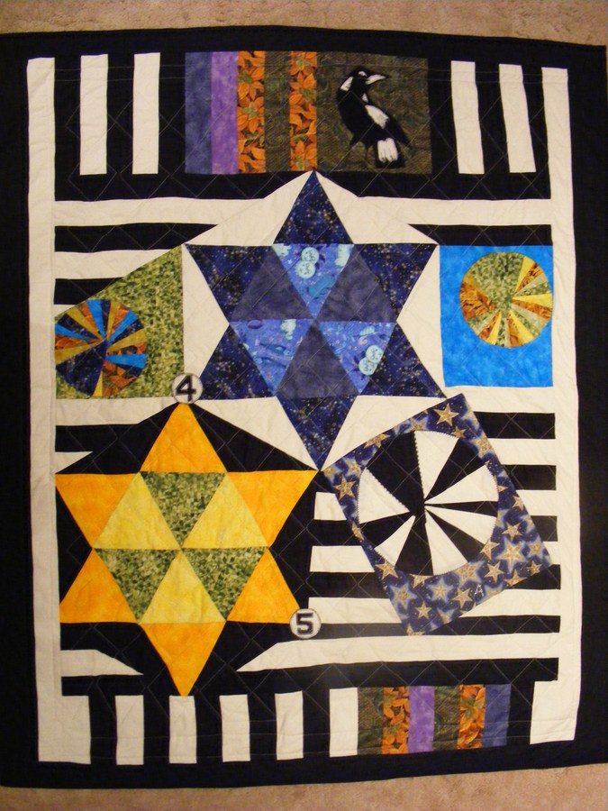Kymbo Crazy pies - My dear friend is totally mad about her australian football team the "Collingwood Magpies". tha back of the quilt is an image of the black and whites stripes of thier guernsy, The front has an applique magpie bird which is the mascot. The rest of the quilt is crazy patch of pie charts and random shapes to represent how crazy she is for her team. I loved making it so much. I purposely made no pattern, I just let the design unfold, I have never attemped this before and it was really fun.