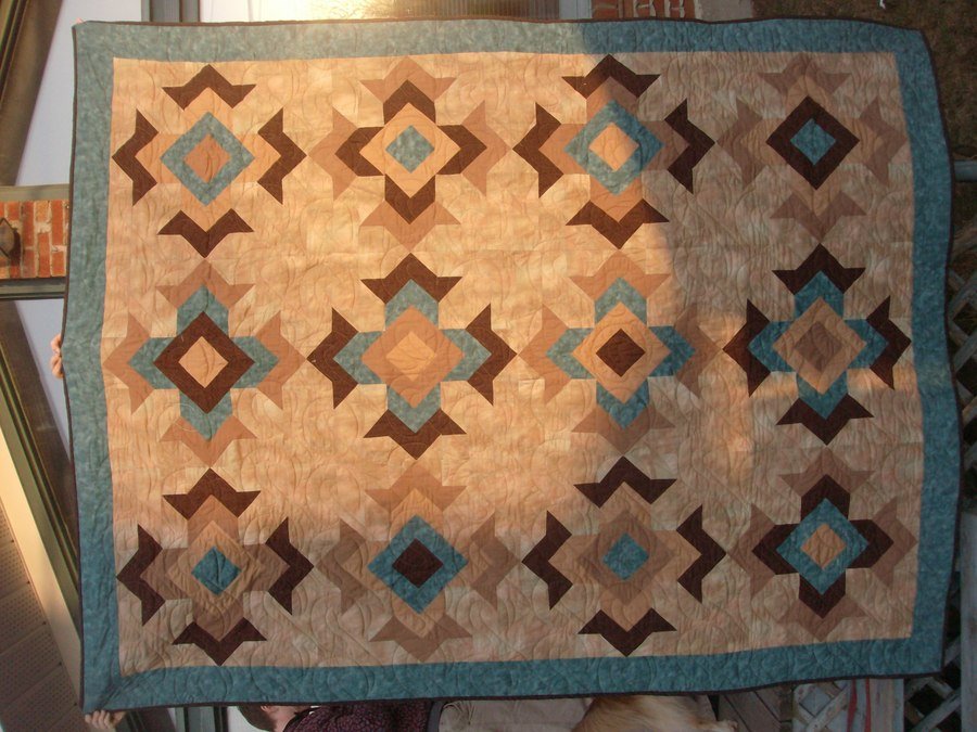 crocus999 Michael's Quilt - This was my first 'big' quilt. I didn't know what I was getting into, but liked the pattern. My son didn't want a 'traditional' patchwork or 'country' coloured quilts. This one is traditionally in bright colours and black background, but I changed to these warmer colours for my son; these are his colours.
